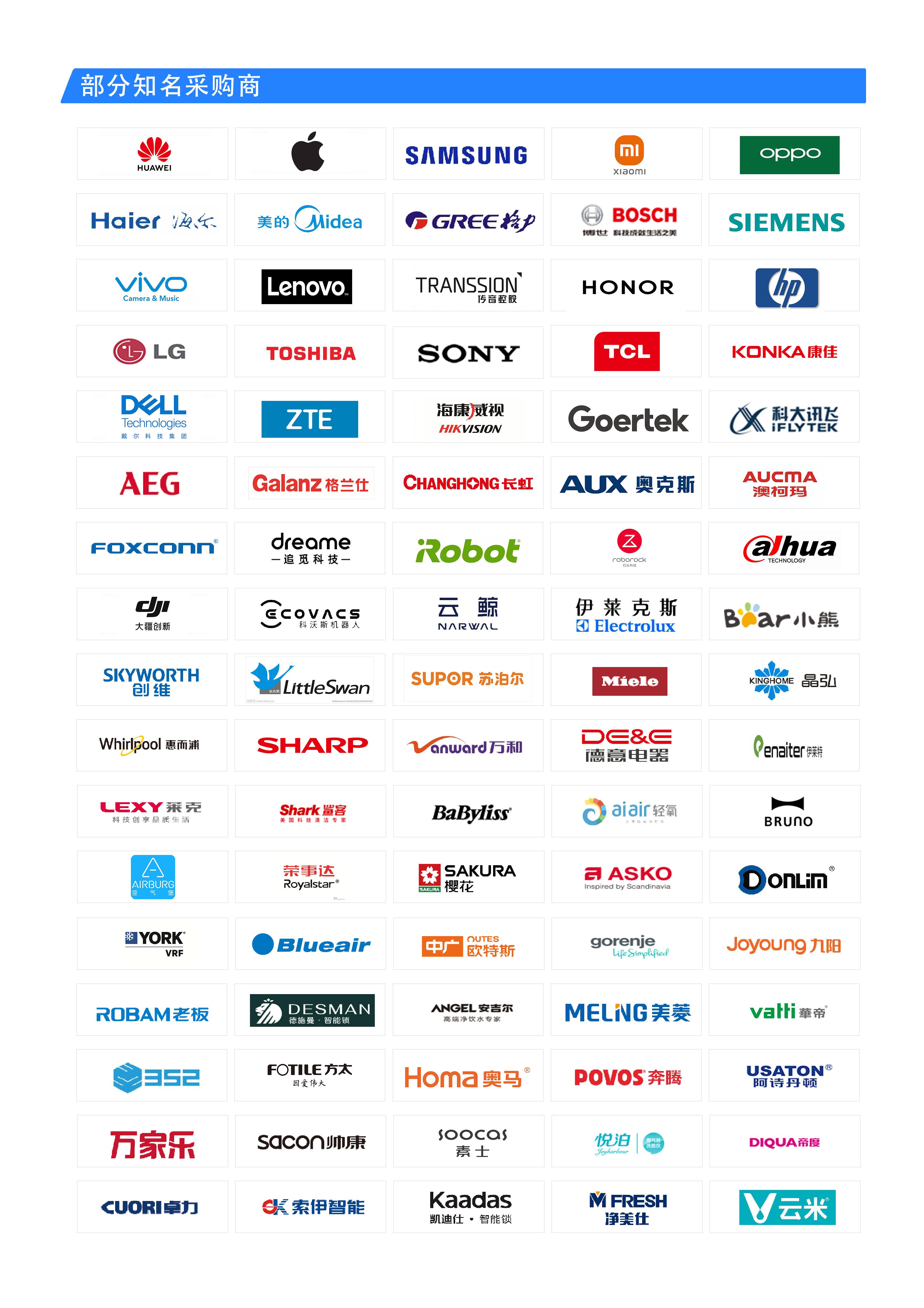 5.部分VIP观众和采购商:海尔、美的、格力、华为、苹果、小米、OPPO、海信、TCL、康佳、联想、荣耀、VIVO、大疆、长虹、创维、奥克斯、博世、西门子、松下电器、东芝、三星、LG、荣事达、格兰仕、美菱、澳柯玛、小天鹅、美大、方太、老板、华帝、帅康、樱花厨卫、阿里斯顿、林内、苏泊尔、九阳、万和、万家乐、AO史密斯、云米、莱克、爱仕达、艾美特、伊莱克斯、伊莱特、小熊电器、安吉尔、净美仕、阿诗丹顿、布鲁雅尔、亚都、戴森、绿岛风、科沃斯、云鲸、石头科技、追觅、一点、晓舞、艾罗伯特等;